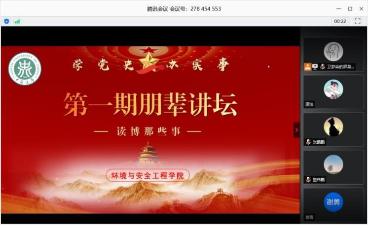2021年4月12日19:00,第一期朋辈讲堂——“读博那些事儿”正式开讲。讲堂采用线上会议形式,邀请了哈尔滨工业大学的孙淼、北京理工大学的梁家豪、武汉理工大学的衡怡君、西安交通大学的高宏飞以及禁忌书屋