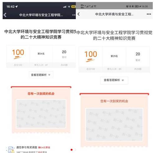 组织开展了“学习贯彻党的二十大精神”网络知识竞赛活动。此次竞赛内容涵盖了中国共产党党史、《中国共产党章程》、党的二十大报告等内容,营造了“以考促学、以学验知、以知笃行”的浓厚学习氛围,进一步激发了广大党员同志们的学习热情,加深了大家对党史、党章、党纪、党的二十大精神的认识与理解,巩固检验了党史学习教育常态化的学习教育成果。