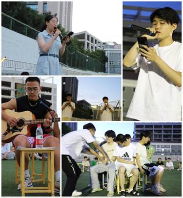 2022级学生在东区足球场举行了土木专业联谊会。晚会共包括听歌识曲,同学个人唱歌表演,吉他弹唱,传声筒和集体大合唱等15项趣味活动。