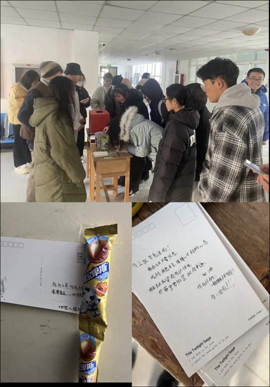 本次活动首先由低年级学生写下对考研学生的祝福,之后由学院心理站送到学院115个大四学生宿舍,活动在文韬六七一楼大厅举办,吸引众多同学参加,来写祝福的人络绎不绝,在心理站工作人员的组织下有条不紊的写下祝福。可爱的卡通人物、富有美感的艺术字体、一句句手写的真挚祝福,学生们热情的鼓励和浓浓的真情融入到小小的卡片中。一张张写满“金榜题名”“旗开得胜”“研途星光,不负你我”等寄语的明信片携同糖果送到考研学子手中,小小明信片,情谊满满,这是来自学院的特殊礼物。