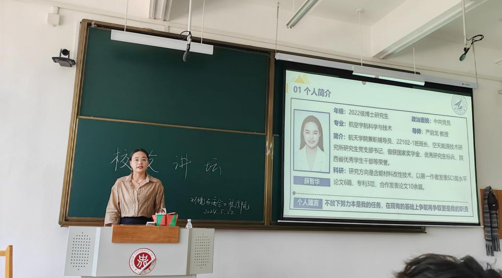 为进一步加强学风建设,大力营造健康向上、奋发有为、力争上游的学习氛围,激发学生学习动力,2024年5月22日下午,我院邀请2015级校友,西北工业大学在读博士薛智华为特种能源技术与工程专业学生开展“榜样的力量”校友讲坛。