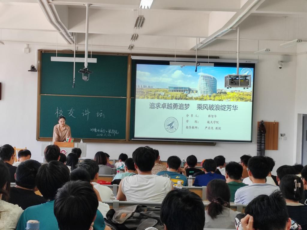 薛智华为同学们做了“追求卓越勇追梦,乘风破浪绽芳华”主题讲座,向同学们介绍了她的成长经历、课题组情况,鼓励大家勤奋学习,积极参与科研活动,学习阅读文献资料,“不积跬步无以至千里”,做学问就要脚踏实地,勇于创新,不断积累。作为班长、党支部书记、兼职辅导员,薛智华鼓励同学们积极参加学生活动,在学生工作中,学会合理规划时间,提高执行力,学会与人合作,在细节中磨练心性,大学生应该努力提高综合素质,在未来的就业中才能崭露头角。结合军工专业特色,她勉励大家,“不负韶华,挺膺担当争做具有家国情怀,追求卓越的‘总师’型人才,为祖国国防和航天事业贡献力量!”